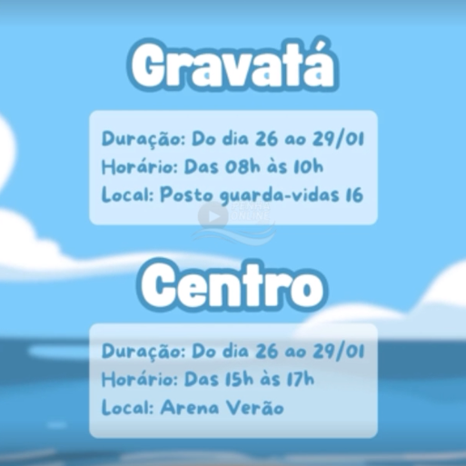 A primeira turma será realizada no bairro Gravatá, com atividades entre os dias 26 e 29 de janeiro, no horário das 8:00h às 10:00h, no Posto Guarda-Vidas 16. Já a segunda turma acontecerá no Centro, também entre 26 e 29 de janeiro, das 15:00h às 17:00h, na Arena Verão. As inscrições estarão abertas a partir do dia 19 de janeiro, às 12:00h. As vagas são limitadas.