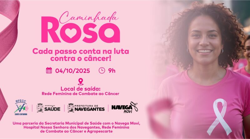 A Prefeitura de Navegantes, por meio da Secretaria de Saúde, em parceria com a Rede Feminina de Combate ao Câncer (RFCC) vai promover, no próximo sábado, 04 de outubro, a partir das 9h, no Centro, uma caminhada em alusão ao Outubro Rosa – mês de conscientização sobre a prevenção e o diagnóstico precoce do câncer de mama.