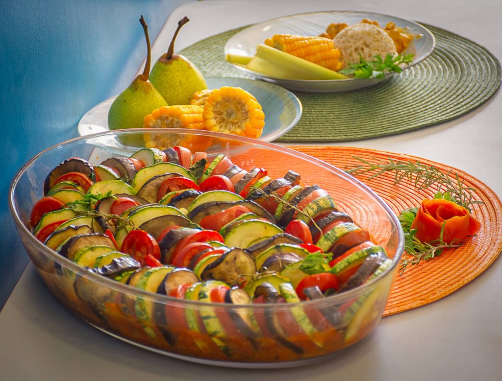 Entre os pratos oferecidos estiveram arroz integral, lentilha, filé de frango em cubos com creme de grão-de-bico, salada de ratatouille e milho-verde cozido – refeições inspiradas no Mar Mediterrâneo. A composição respeita as diretrizes do Programa Nacional de Alimentação Escolar (PNAE) e foi planejada pelo Departamento de Nutrição com foco na qualidade nutricional e na ampliação do repertório alimentar dos estudantes.
