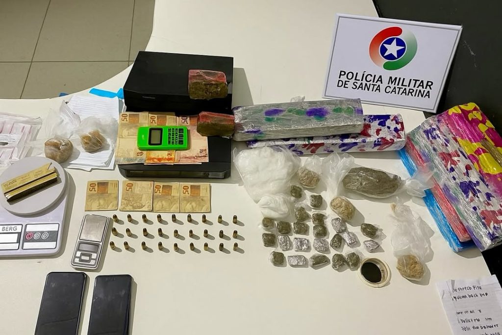 A Polícia Militar realizou uma ação que resultou na prisão de duas pessoas por tráfico de drogas, associação ao tráfico e posse de munição de uso restrito. Durante as diligências, um homem e uma mulher foram abordados, momento em que diversos materiais foram apreendidos, sendo eles: 7,5 kg de maconha, 400g de cocaína, 300g de crack, 49 munições cal. 9mm, duas balanças de precisão, cinco celulares, dois aparelhos de monitoramento de imagens e R$ 1.350,00 em dinheiro. Ao final da apuração, o casal foi conduzido à Central de Plantão Policial de Itajaí e ficaram à disposição da Justiça.