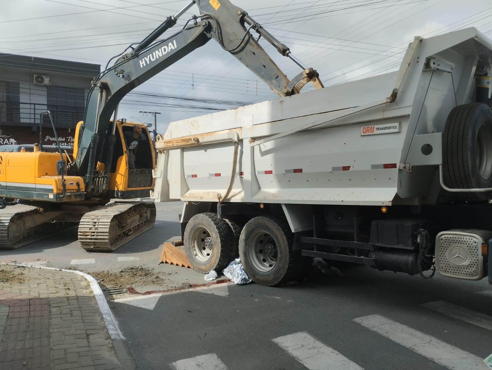 Devido à carga de areia, os bombeiros precisaram utilizar uma escavadeira para retirar parte do material da caçamba e levantar o caminhão para liberar a vítima.