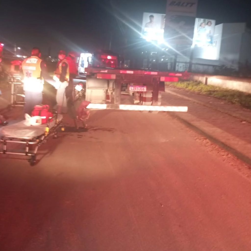 Motoqueiro bate atrás de caminhão parado e sofre ferimentos graves em Navegantes