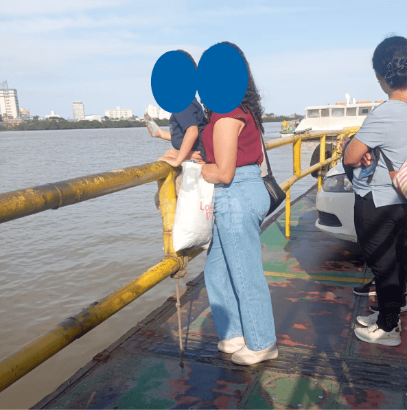 “Quero fazer uma denúncia de irresponsabilidade no ferry boat. Uma mãe colocou o filho em cima da cancela e em nenhum momento foi advertida pela equipe do ferry”, relatou ela. Na imagem é possível ver o braço da mulher envolve o abdômen da criança, contudo, em caso de algum mal súbito ou até mesmo de ocorrência de “solavanco” da água do rio junto à embarcação, a criança poderia vir a cair.