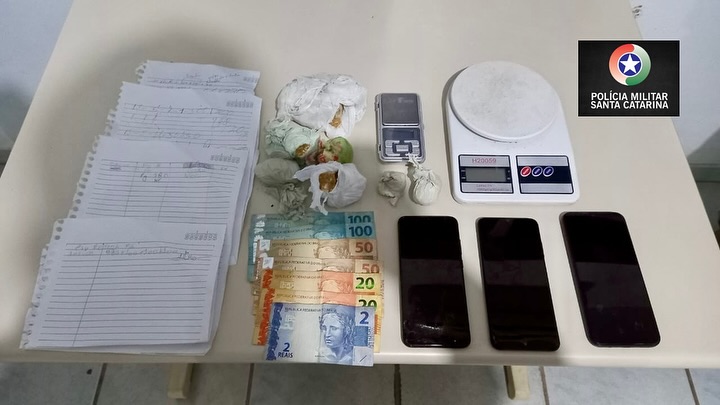 Uma ação conjunta entre o 25º Batalhão de Polícia Militar (BPM) e o 15º BPM resultou na prisão de dois homens por tráfico de drogas. A ação teve início em Navegantes, no bairro Meia Praia, quando a Polícia Militar identificou e prendeu um foragido na Rua Milton Seara Muller. Os policiais também apreenderam R$ 3.000,00 em espécie, dois celulares e documentos com registros contábeis do tráfico. Durante a abordagem, o criminoso manuseava anotações referentes ao tráfico e confessou que armazenava entorpecentes com um comparsa em Frauburgo. Com as informações obtidas, as guarnições de Fraiburgo abordaram o segundo envolvido e realizaram a apreensão de 385 gramas de crack, 20 gramas de cocaína, R$ 342,00 em espécie, quatro celulares e diversas anotações ligadas ao tráfico.