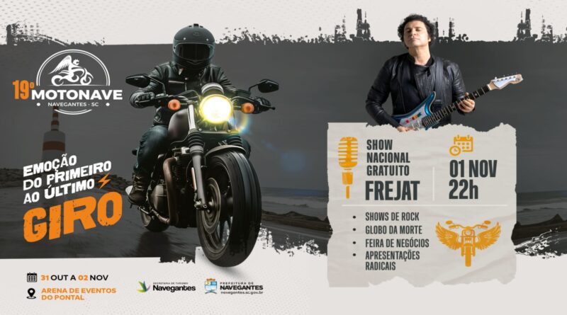 A Prefeitura de Navegantes, por meio da Secretaria de Turismo, divulgou a programação completa do 19º Motonave — um dos mais tradicionais encontros de motociclistas do Sul do Brasil. O evento gratuito acontece de 31 de outubro a 2 de novembro, na Arena do Pontal, tendo o cantor Frejat como atração nacional.