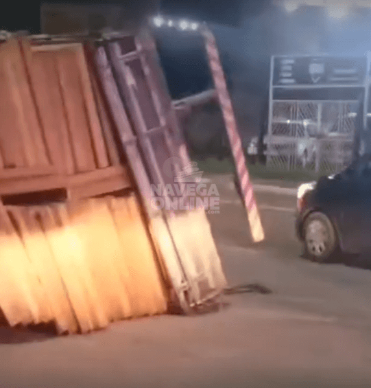 [VÍDEO] Navegantes: caminhão carregado de madeira tomba ao passar em rotatória